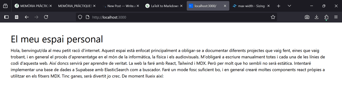 Hola, benvingut/da al meu petit racó d'internet. Aquest espai està enfocat principalment a obligar-se a documentar diferents projectes que vaig fent, eines que vaig trobant, i en general el procés d'aprenentatge en el món de la informàtica, la física i els audiovisuals. M'obligaré a escriure manualment totes i cada una de les línies de codi d'aquesta web. Així doncs servirà per aprendre de veritat. La web la faré amb React, Tailwind i MDX. Però no serà només una web estàtica, intentaré implementar una base de dades a Supabase amb ElasticSearch com a buscador, fer un mode fosc xulo, i en general crear moltes components react pròpies a utilitzar en els fitxers MDX. Tinc ganes, serà divertit jo crec. De moment llueix així: